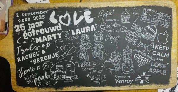Op zoek naar iets bijzonders voor een bruiloft, verjaardag of jubileum? Met een gepersonaliseerde plank geef je een verrassend en blijvend aandenken. Jij levert steekwoorden of kiest een thema, en ik maak er een creatief en persoonlijk ontwerp van.